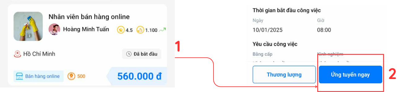 Cách ứng tuyển: 1. Tìm công việc phù hợp. 2. Mở tin tuyển dụng. 3. Nhấn Ứng tuyển ngay.