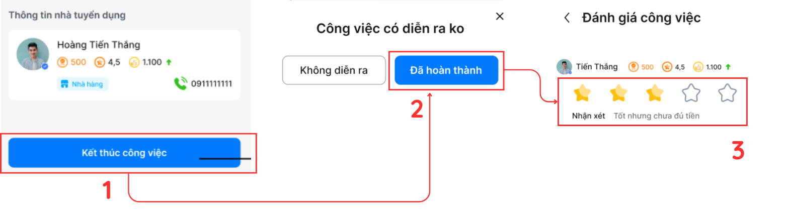 Cách thao tác: 1. Tại tin tuyển dụng, chọn Kết thúc công việc. 2. Xác nhận Đã hoàn thành. 3. Thực hiện đánh giá hoặc báo cáo trường hợp không tham gia.