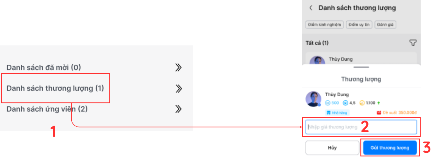 Cách thao tác: 1. Tại tin tuyển dụng, chọn Danh sách thương lượng. 2. Chọn ứng viên cần trao đổi. 3. Nhập mức lương đề xuất và nhấn Gửi thương lượng.