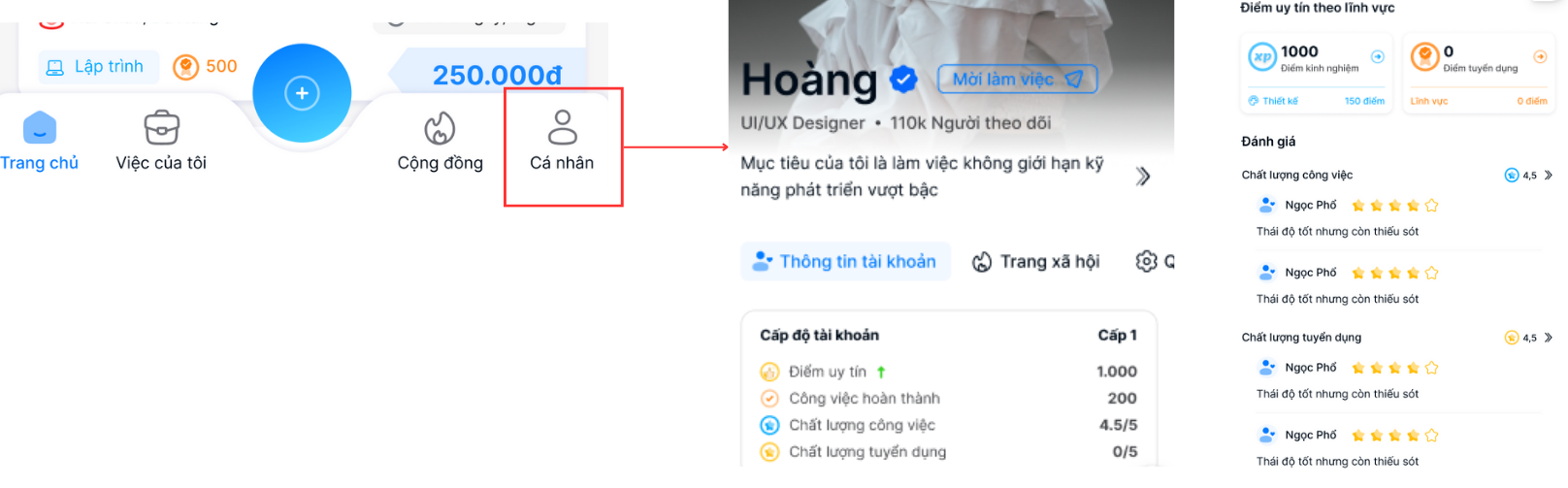 Trang Profile hiển thị kỹ năng, lịch sử làm việc, điểm uy tín và đánh giá. Đây là hồ sơ thương hiệu cá nhân giúp bạn tạo ấn tượng với đối tác còn lại. thương hiệu cá nhân giúp bạn tạo ấn tượng với đối tác còn lại.